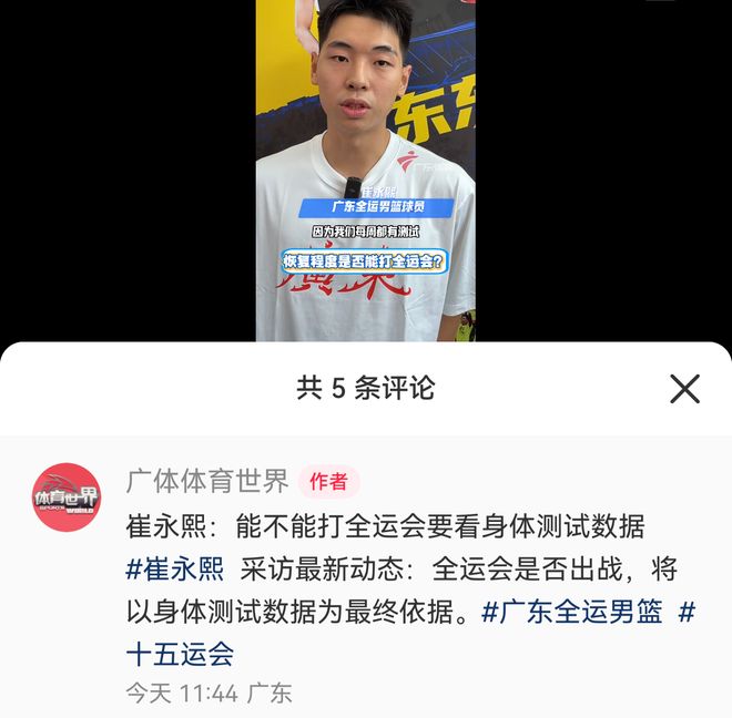 雷速体育10月30日讯 近日,广东队球员崔永熙接受“广体体育世界”采访,谈到了自己能否出战全运会的问题。