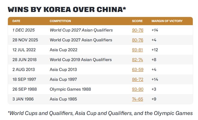 事实上,中国队前不久刚赢过韩国队。今年亚洲杯四分之一决赛中,中国队以79:71击败对手,时隔10年再度打入亚洲杯四强。