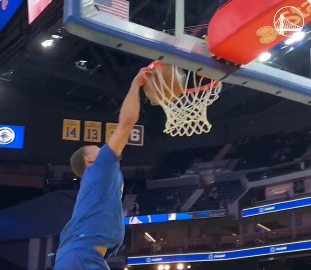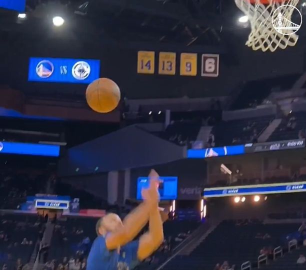 就是准!库里赛前热身时连中logo三分,轻松写意