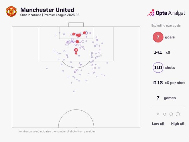 曼联前7轮完成110次射门、创造14.1预期进球,均高居英超第一